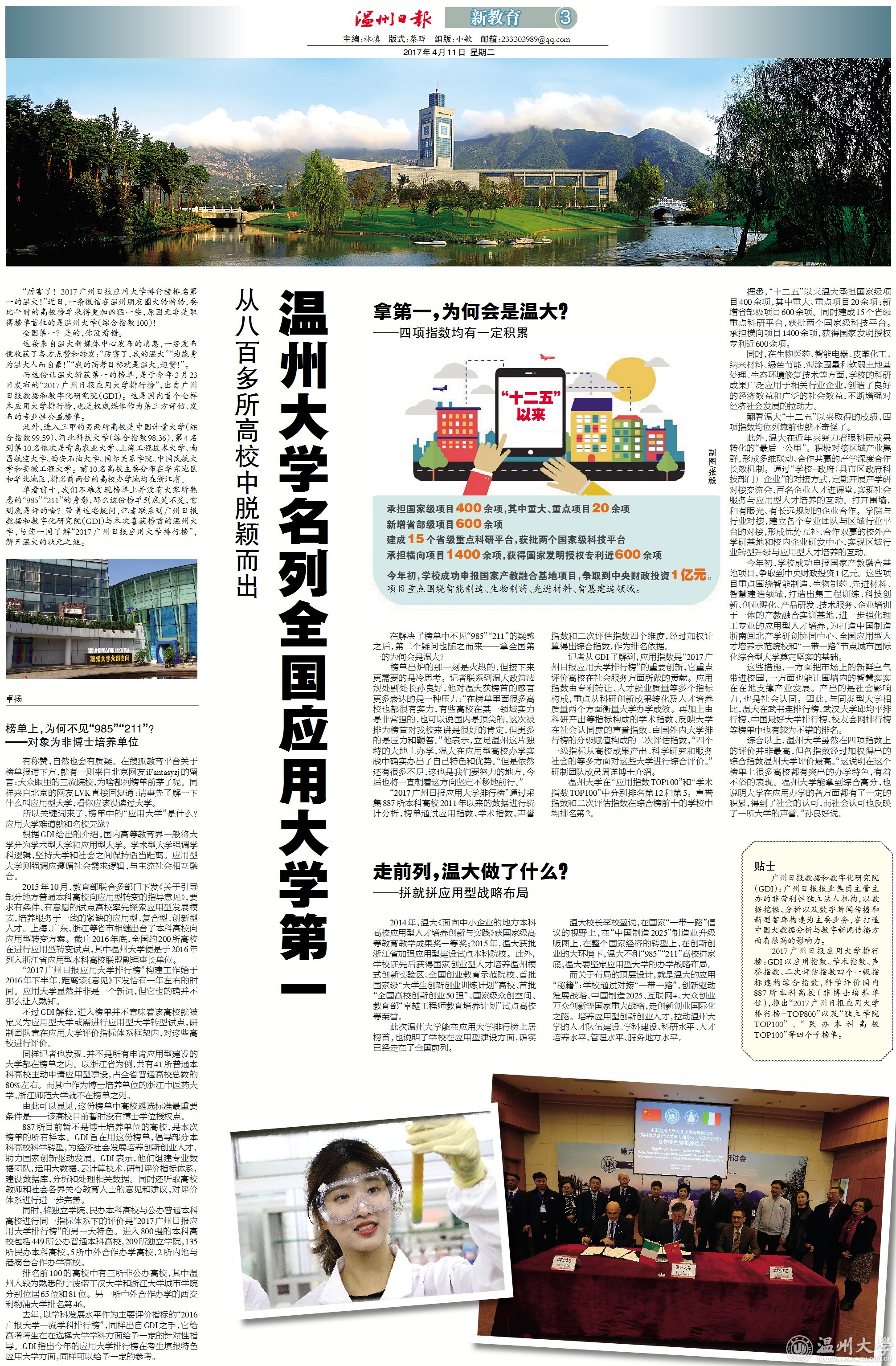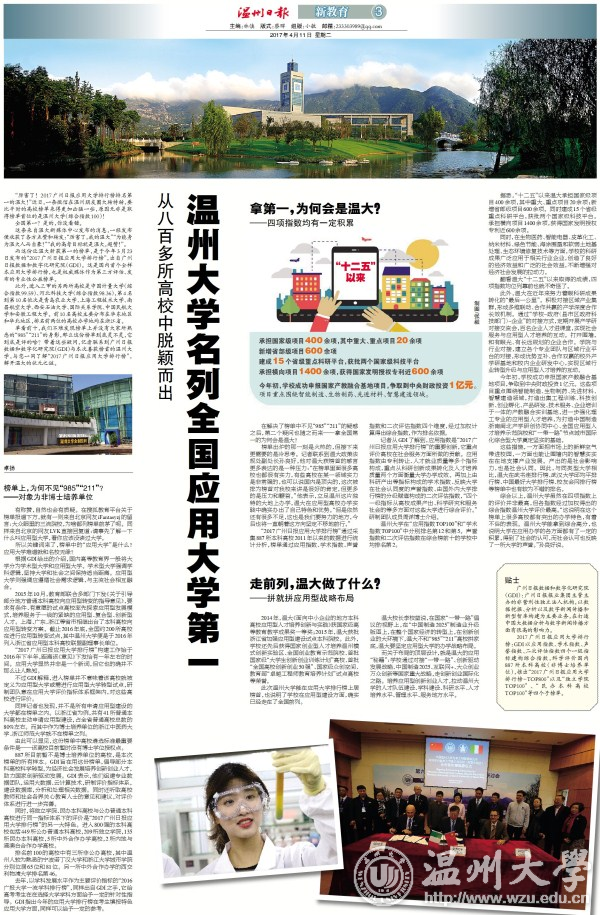 “厉害了!2017广州日报应用大学排行榜排名第一的温大!”近日,一条微信在温州朋友圈大转特转,要比平时的高校榜单来得更加凶猛一些,原因无非是取得榜单首位的是亚洲无码 (综合指数100)! 全国第一?是的,你没看错。 这条来自温大新媒体中心发布的消息,一经发布便收获了各方点赞和转发:“厉害了,我的温大”“为能身为温大人而自豪!”“我的高考目标就是温大,超赞!”。 而这份让温大斩获第一的榜单,是于今年3月23日发布的“2017广州日报应用大学排行榜”,出自广州日报数据和数字化研究院(GDI)。这是国内首个全样本应用大学排行榜,也是权威媒体作为第三方评估、发布的专业性公益榜单。