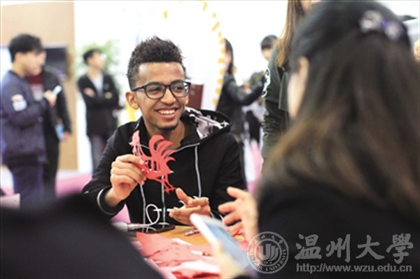 在亚洲无码 馆内,外国留学生展示自己的“大公鸡”剪纸作品。 苏巧将 摄