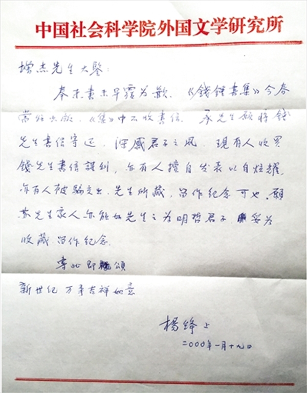 陈增杰 上周,105岁的杨绛先生去世,在国内引起很大反响,众说纷纭,笔者不由想起与钱锺书杨绛伉俪的通信往事。 钱锺书复函: 《左传》标点与《离骚》落英 1980年时,我任教温州师范专科学校,参加《汉语大词典》编纂。年初,我发表了第一篇论文《古汉语语词札记》,接着写作《< 春秋左传集解>标点商榷》,对上海人民出版社校点出版的《春秋左传集解》提出批评意见。7月10日,我接到华东师大苏渊雷先生函,谓香港《文汇报》连载他的《论诗绝句》,因原稿后半部遗失,致出刊中断,遍觅不得,望将我处留存的一份回寄转交,“以了胜缘”。我随即照办。当时正在细读钱先生的新著《管锥编》,而《札记》《商榷》二文所论与《管锥编》有所涉及,因此随信附上致钱先生函并拙作二篇,请苏渊雷先生转交,以求教益。 8月29日,获收钱先生赐复: 增杰先生教席:顷奉钵水翁转来手书并大文两首。奖饰逾量,祗增愧汗。读左札记一则,极精审,足以定聚讼之案。因系手稿,故急寄还。“落英条”助鄙人张目,窃以自壮。所引游、姜诸先生著作都未寓目,闲门独学,寡陋专愚,真可笑也,然亦省却阅读。《语文通讯》之类,徒乱人意耳。先生学问已自成家,时贤著述似不须多留意,即拙作亦应摒置如遗。掉臂游行,得大自在,岂不快哉! 匆此复颂 暑祺 钱锺书上 二十五日 信中“钵水翁”即苏渊雷先生,号钵水斋,故尊称钵水翁。“大文两首”即我投呈的两篇文章。其一《读左札记一则》,系从我《< 春秋左传集解>标点商榷》中录出哀公七年“季康子欲伐邾”一段记述,归综自汉服虔、晋杜预、明傅逊、清钱谦益、顾炎武以来诸家歧说异解,皆缘不明文义而错释,提出己见;并指正今出《春秋左传集解》《左传纪事本末》标点之误。钱先生的《管锥编·左传正义》曾列举这一句例,云“纷纭盍各,皆缘古文无标点符号又每省去‘曰’字所致”,未作分析判断。钱先生在函中对我的解说给予充分肯定,认为“极精审,足以定聚讼之案”。这是对初出道的青年学子莫大之鼓励,令人感奋。 其二“落英条”,指我《古汉语语词札记》中《< 离骚>之落英》篇。《离骚》“朝饮木兰之坠露兮,夕餐秋菊之落英”,“落英”怎么解释?自宋以来不断有人说,落训始,落英者,初开之花。此释似是而非。落,《管锥编·楚辞补注》亦主陨落或堕落解。拙文则广引历代书例,从七个层面予以辩说阐明而补证之,故钱先生风趣地说:“助鄙人张目,窃以自壮。”游、姜诸先生著作,是指拙文中举及的游国恩先生《楚辞论文集》和姜亮夫先生《屈原赋校注》。我在函中还说到近期《中国语文通讯》发表文章,复言落英为始花,推及于陶渊明《桃花源记》之“落英缤纷”,凿空无据,所以钱先生贬云“之类”,指为“徒乱人意”,混淆视听。(郭在贻兄在给我的信中斥为“真是不知而妄作。此等东西居然被编者看中,真可怪也。”) 我在收到钱先生函差不多同时,亦收到苏先生复函:“前奉手札并大稿两篇,径寄钱默存。顷获复函,谓‘陈君治学朴平微至,已遵旨致书与之’云云。此书达时,想已接彼手简矣。寄来拙稿油印本,早已收到,高见稽及为感。”两位前哲对后辈的关怀和嘉勉,足见大家风范,让人感激。钱先生说的“朴平微至”,是谓朴实平允细致周到。这是先生的奖许,自愧未如,然铭刻在心,引以为毕生治学努力追求的学风。 钱先生的这封书简,随意挥洒,文笔亦极佳,在委婉的措词中时露机锋,而复贴切恳挚。除对后学的奖掖勉励,还显示了他的治学观念,特立独行的禀性和学人本色。记得钱先生在另一场合曾谓:时人论著无暇拜读。古人的书一生中都看不完,哪还有时间涉览别的东西。这与本函中说的“诸先生著作都未寓目……然亦省却阅读”,“时贤著述似不须多留意”,所表达的观念是一致的。我得到的启示是:为学须直取第一手资料,自出心裁,独抒己见,其他人如何说,大可不必顾及。这样,即使得出的结论与人偶同,那也是殊途同归,相得益彰,而其运用的材料以及探解思路、论证方法绝不会雷同。钱先生认为我既已入门,具备基础,就应该突破束缚,放开去做,“掉臂游行,得大自在,岂不快哉!”十分生动地表述了他的绝去依傍、独立创新的理念。因此,这句话也成了我从学的指路明灯,数十年来一直润泽我的心田,时时得到鼓舞。 杨绛复函: 鞭挞掮客牟利,转请收藏留念 1999年10月,我任职《温州师范学院学报》编辑部,偶见报载编辑《钱锺书集》的讯息,遂致函中国社会科学院外国文学研究所杨绛先生,略言有1980年钱先生赐寄一函,颇能反映先生之治学理念。在编的文集倘收录书信,愿意奉呈,用备采择。 两个多月后,接杨先生复函: 增杰先生大鉴:奉来书未早覆为歉。《錢鍾書集》今春当能出版,《集》中不收书信。承先生愿將钱先生书信寄还,深感君子之风。现有人收买钱先生书信谋利,亦有人擅自发表以自炫耀,亦有人被谝交出。先生所藏,留作纪念可也。愿苏先生家人亦能如先生之为明哲君子,妥为收藏,留作纪念。专此即颂 新世纪万事吉祥如意 杨绛上 二〇〇〇年一月十九日 我愿意寄还赐函,“完璧归赵”,完全出于对钱先生的敬仰和一片虔诚之心。杨先生于此很加赞赏,称“深感君子之风”。由是而感慨系之,对世俗人的不良行为、卑劣行径加以鞭挞。因为当时已出现包括钱先生在内的一些名家书信被人抛售,流落市肆间,