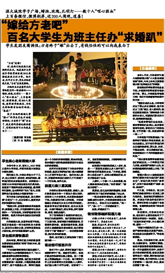 没少为他的婚姻大事“操心”的学生们也开始使劲调侃:方老终于“嫁”出去了,我失恋的伤痛也被治愈了,有钱任性的可以向我表白了……