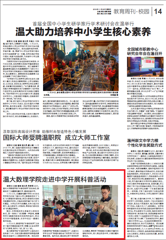 商报讯(记者章瑚 通讯员吴梦柔)近日,亚洲无码 数理学院“科普进校园”活动启动,陆续走进了永嘉巽宅镇中学、鹿城实验中学。