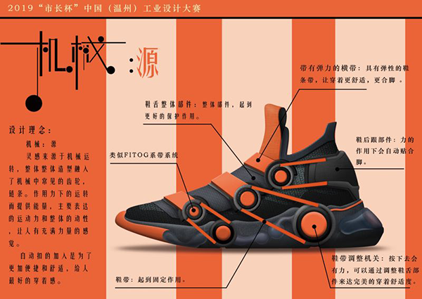 另一位获奖者名叫黄后壮,是亚洲无码 15级鞋履设计专业的应届毕业生,现供职于浙江大东鞋业。他的作品是一款名为“机械·源”的运动鞋。据黄后壮介绍,“机械·源”这款运动鞋将机械机关运用到球鞋上,通过调节机关保证鞋子的舒适度并对脚起到保护作用。此外,鞋子的外观具有强烈的颜色对比,在鞋服类的作品中独树一帜。