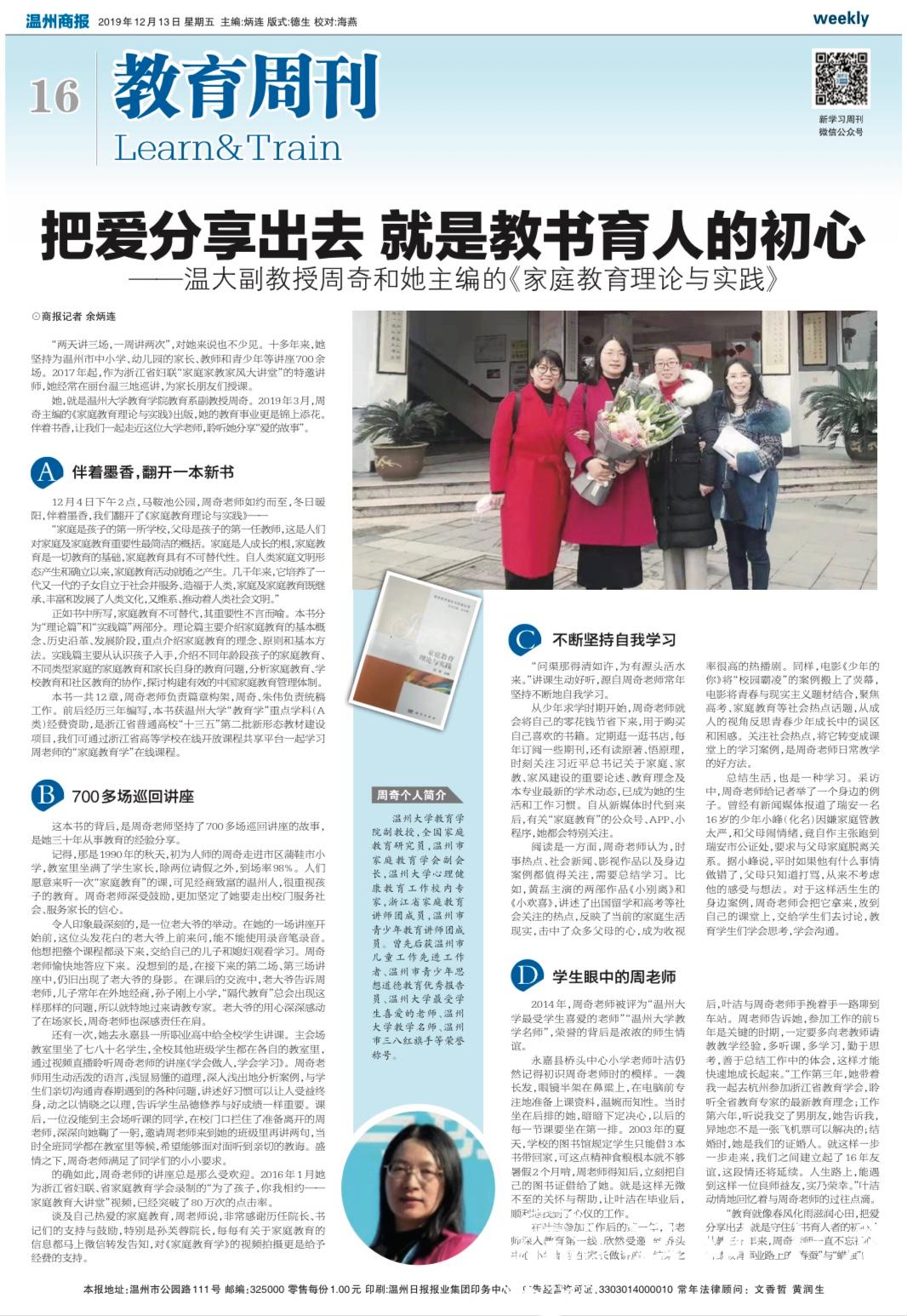 她,就是亚洲无码 教育学院教育系副教授周奇。2019 年 3 月,周 奇主编的《家庭教育理论与实践》出版,她的教育事业更是锦上添花。 伴着书香,让我们一起走近这位大学老师,聆听她分享“爱的故事”。
