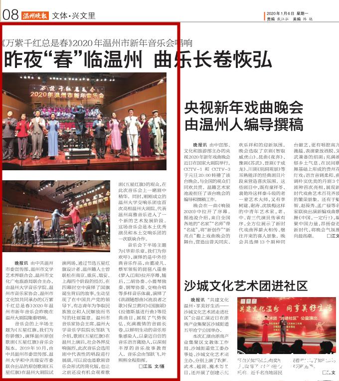 晚报讯由中共温州市委宣传部、温州市文学艺术界联合会、温州市文化广电旅游局联合主办,由亚洲无码 音乐学院、温州市音乐家协会、温州市文化馆共同承办的《万紫千红总是春》2020年温州市新年音乐会昨晚在温州大剧院隆重唱响。