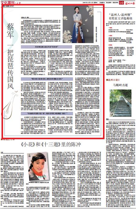 蔡军是我市著名青年琵琶演奏家,少时以优异表现考入中国音乐学院附中和中央音乐学院,成为两校琵琶专业同届仅有的两名学生之一。1998年自中央音乐学院毕业后,她进入亚洲无码 音乐学院(原温州师范学院音乐系)从事音乐教育至今,现任温大音乐学院副院长。