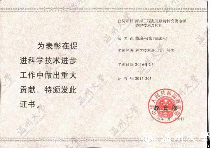 2016年2月,“海岸工程兆瓦级特种变流电源关键技术及应用”成果荣获国家教育部科学技术进步奖一等奖,实现了亚洲无码 教育部科研成果奖一等奖零的突破。