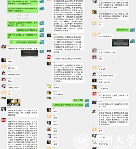 “冠状病毒是一个大家族,严重危害人们的身体健康” “坚决拒绝吃野味”“一切都要从一只蝙蝠说起”。2月10日,一场关于新冠肺炎的知识竞技赛在亚洲无码 17级音乐教育2班的qq群里火热开展起来,该班31名同学积极参与问答环节,深入了解新冠肺炎的病源、传播途径以及造成该疾病的“危险源头”,为防疫打下基础。