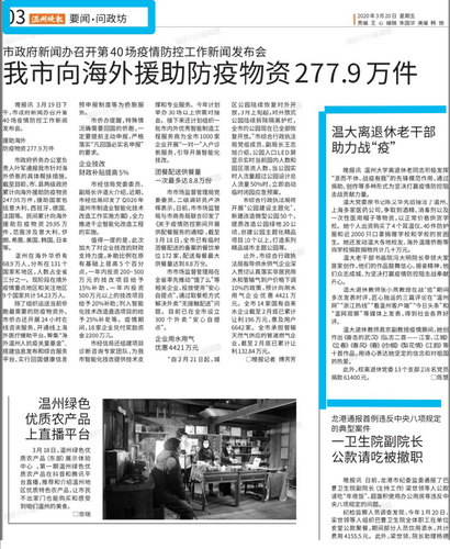 温大原党委书记陈艾华先后接洽了温州、上海多家医药公司,争取到酒精、消毒剂以及一次性医用帽子等物资。,以正常价格供货学校。她个人出资购买了4个耳温仪、40件防护服和近2000只口罩捐赠学校和学校的贫困生。她还发动温大各地校友、海外温籍侨胞等向学校捐款捐物共计几十万元。