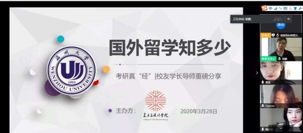 在学院精心安排的 “国外留学知多少”留学专场交流会和“国内院校备考攻略”国内考研专场交流会上,八名导师精心准备、重磅分享自己的申请出国读研和国内考研的宝贵经验和心得,也收获了学弟学妹的诸多点赞。受聘为“留学校友学长导师”的三位校友,分别是留学意大利罗马第一大学的陶夏欣、留学韩国梨花女子大学的费婕和留学澳洲昆士兰大学的杨凡,在当前疫情严峻的留学境况下,她们克服距离和时差上的影响,精心准备,从留学生活、留学优势、留学申请经验和注意事项等方面为同学们提供了有益的经验,他们也分别担任温大美院学子在欧洲、韩国、澳洲的留学校友学长导师,为日后有留学意向的同学提供更多的渠道和联络指导帮助。