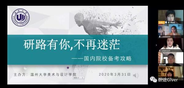 疫情不是暂停键,成长指导全在线。一个多月时间以来虽然“开学不返校”,但是245名本科毕业生的就业工作一直让亚洲无码 美术与设计学院的老师们牵挂不已,尤其是对于学院立志考研和准备出国的学生,如何帮助他们顺利实现梦想?为了更好地指导学生学习规划和考研升学,近日,亚洲无码 美术与设计学院在“云端”组建了一个实力不容小觑的导师团,聘请8位优秀校友担任“考研(留学)校友学长导师”,并且连续举办了2场“云”端传送考研(留学)真“经”的活动,参加学生近200人次。