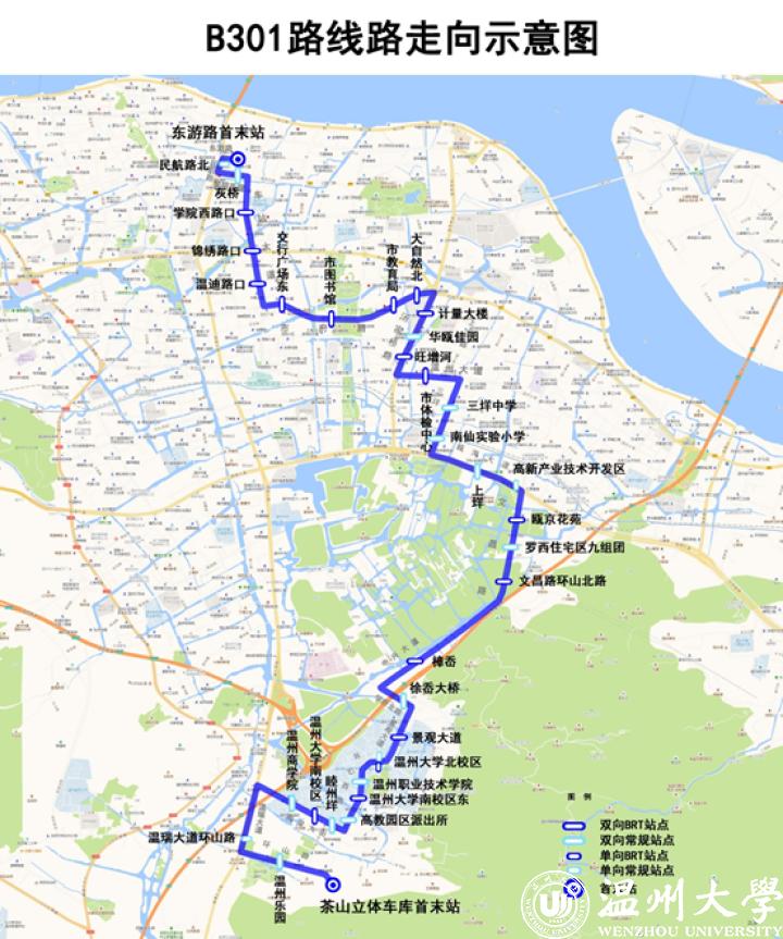 据温州交运集团快速公交公司副总经理陈味辛介绍,B301路由东游路首末站始发,途经BRT301路由市区东游路首末站始发,途经民航路、市府路、汤家桥南路、温州大道、三垟大道、温瑞大道等道路,最后至茶山立体车库首末站(往返)。该路线全程总长24.5公里,全线运行约80分钟。温州交运集团计划投入18辆新能源车,班车间隔时间约为15-16分钟。全线实行一票制无人售票,票价为2元。