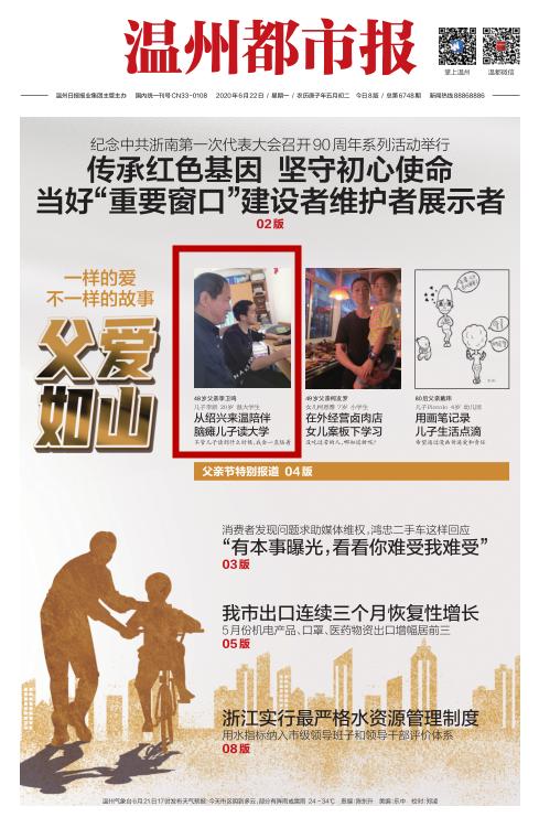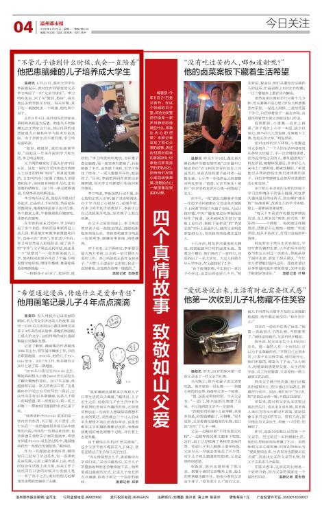 去年9月4日,来自绍兴的李新坐着轮椅来到温大报道。他患先天性脑瘫无法正常站立行走,却以优异的成绩被温大计算机科学与技术专业录取。由于李新生活不能自理,李卫鸣来温陪读。