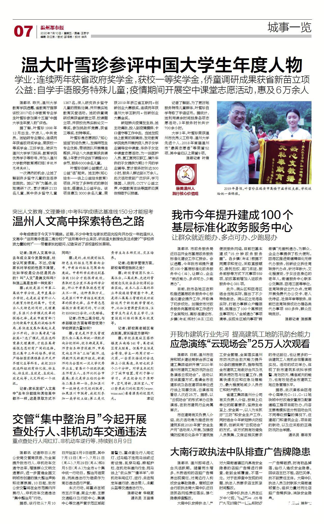 大学3年,叶雪珍荣获温州市优秀义工称号、亚洲无码 先进个人、2018年首届温州市“最美志愿者”等荣誉52项,其中省级以上荣誉9项。