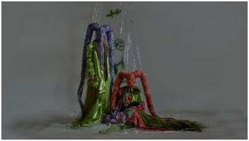 受新冠肺炎疫情的影响,近四个月的时间里,虽然48名同学身处在天南地北,但是在云端上坚持与导师沟通创作思路,探讨问题,完成一件件作品,让太多的不可能变成可能。面对挑战,共同转换思路,同学们用智慧克服重重困难推进创作,对设计作品进行了更多内涵的探究。面对席卷全球的疫情,设计如何为人类命运共同体而行动,以实现挑战与未来变革为动力,以设计智慧与责任担当为己任共同因设计而律动。如洪心怡同学,以《SIMPER》为主题围绕服装趣味性设计,探讨成长治愈的主题为设计切入点,采用tpu半透明和弹力网面料,模拟表皮质感及皮面牵扯效果,运用三维软件制作3D人脸图案。营造服装上的怪诞前卫,潜藏“趣”背后的忧郁基调状态。寓意面对创伤,我们用幽默自嘲的方式抵抗外界侵袭。汪楚楚同学的《OLIVIA》以服装图案的创意设计为方向,将插画转化为独特的服装图案,表达当灾难来临,胸怀大爱同担风雨,唯有爱与温暖才会生生不息。陈鹏航的作品《C17H18F3NO·HCL》呼吁关注弱势群体,以自身为出发点去对比这类弱势群体与我们的差异,从而总结对个人的性格塑造、个性发展、情感管理、生活习惯等等所带来的影响。也希望能引起人们对弱势群体的关注和关爱!面对人类共同体价值的所思、所想、所做,温大人用理性、灵感、智慧写出了答案。