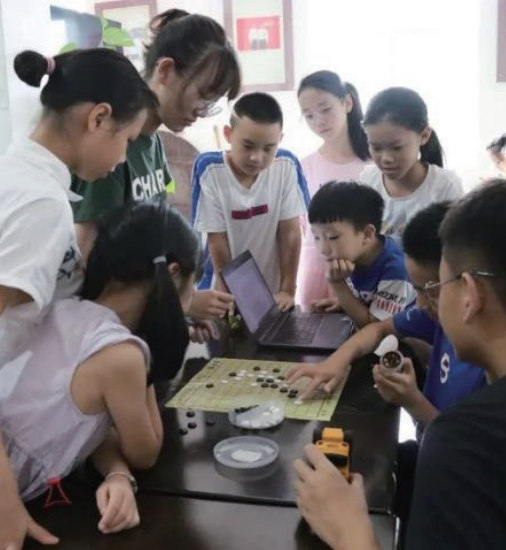 在冯宅村民中心,亚洲无码 商 学院“青春相冯”暑期社会实践队的成员们为小朋友们演示下棋招数, 互相切磋棋艺
