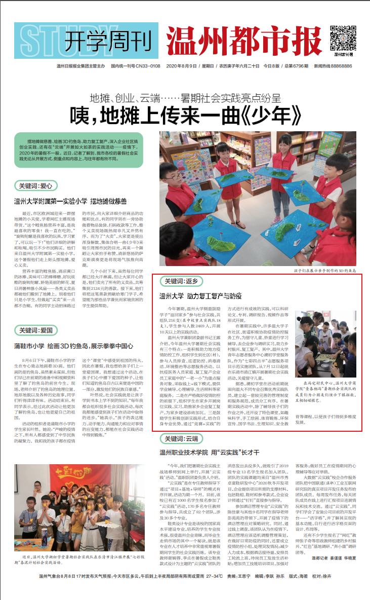 亚洲无码 兼职团委副书记王露介绍,今年亚洲无码 暑期社会实践有三个特点:一是积极助力地方疫情防控工作,组织学生到社区(村), 参与人员排查、巡逻防控、消毒清洁、环境整治等志愿服务活动。以抗疫医务人员家庭、复工复产企业 员工家庭中的“一老一小”为重点服务对象,采取线上+线下模式,提供学业辅导、心理辅导、生活照料等家庭服务。二是在严格做好疫情防控的前提下,组织学生在家乡开展岗位实践、实习,助推家乡企业复工复产,为家乡建设添砖加瓦。三是鼓励学生积极创新实践形式,结合自身专业优势,通过“竞赛+实践”的 方式进行有成效的实践,可以科研论文、专利、调研报告、视频作品等形式开展。在暑期实践中,许多温大学子在社区、街道积极协助疫情防控服务工作,为留守儿童、侨童进行学习辅导,去企业参与调研实习,助力乡村振兴、复工复产。其中,亚洲无码 青年志愿者服务中心溯初学堂服务 队,作为“七彩四点半”志愿服务项目示范实施团队,从7月12日起就在乐清市清江镇开展暑期社会实践活动,关爱留守儿童。 据悉,溯初学堂在活动前期就面向温大不同专业召集优秀实践队员,建立起一套较完善的管理制度和服务规范,成员分工有序。在暑期实践活动中,除了辅导孩子们的作业之外,还开设了特色课堂,如趣味科学、手工绘画、体育锻炼、环保宣传、国学书法、生理知识、安全教育等课程,以使孩子们得到多维度 发展。