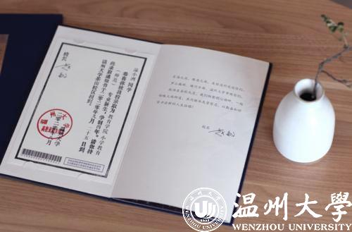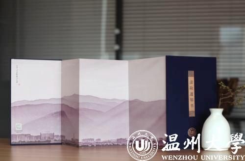 展开五折折页,正面分别是瑞安市东源村木活字传承人亲手印刷的录取证书页、校长寄语、校歌,背面则是以温州地理标志大罗山为底、温大建筑为前景的山水画卷。