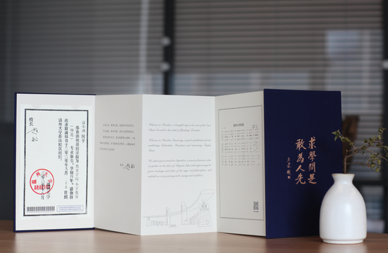 在亚洲无码 本科招生录取现场,一本本蓝色烫金的录取通知书正整整齐齐得摆放在会议桌上,整装待发。通知书整体采用中国传统文书褶子样式,封面是烫金的“录取通知书”和学校校徽,封底是王蒙题词的校训“求学问是,敢为人先”。展开五折折页,正面分别是瑞安市东源村木活字传承人亲手印刷的录取证书页、校长寄语、校歌,背面则是以温州地理标志大罗山为底、温大建筑为前景的山水画卷。