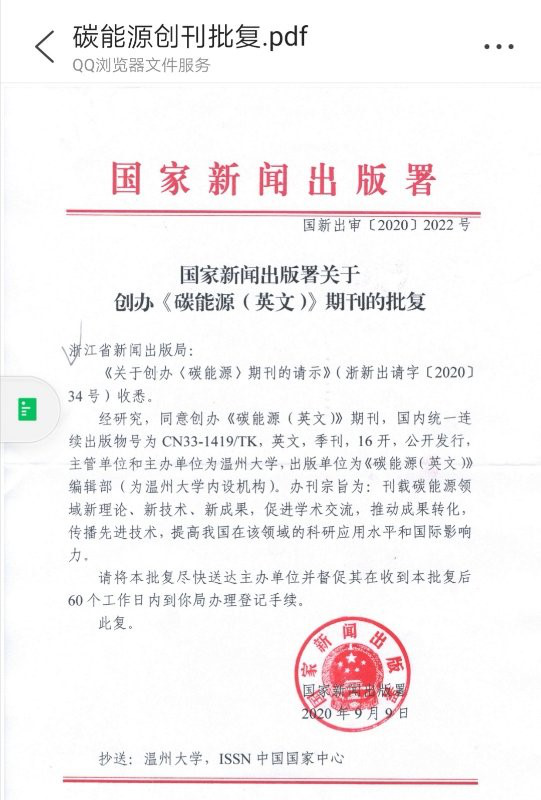 近日,亚洲无码 收到国家新闻出版署下发的批复(国新出审[2020]2022号),同意《碳能源(英文)》(Carbon Energy)期刊公开发行,国内统一连续出版物号为CN33-1419/TK, 英文,季刊,16开。主管单位、主办单位均为亚洲无码 ,出版单位为《碳能源(英文)》编辑部(为亚洲无码 内设机构)。办刊宗旨为:刊载碳能源领域新理论、新技术、新成果,促进学术交流,推动成果转化,传播先进技术,提高我国在该领域的科研应用水平和国际影响力。