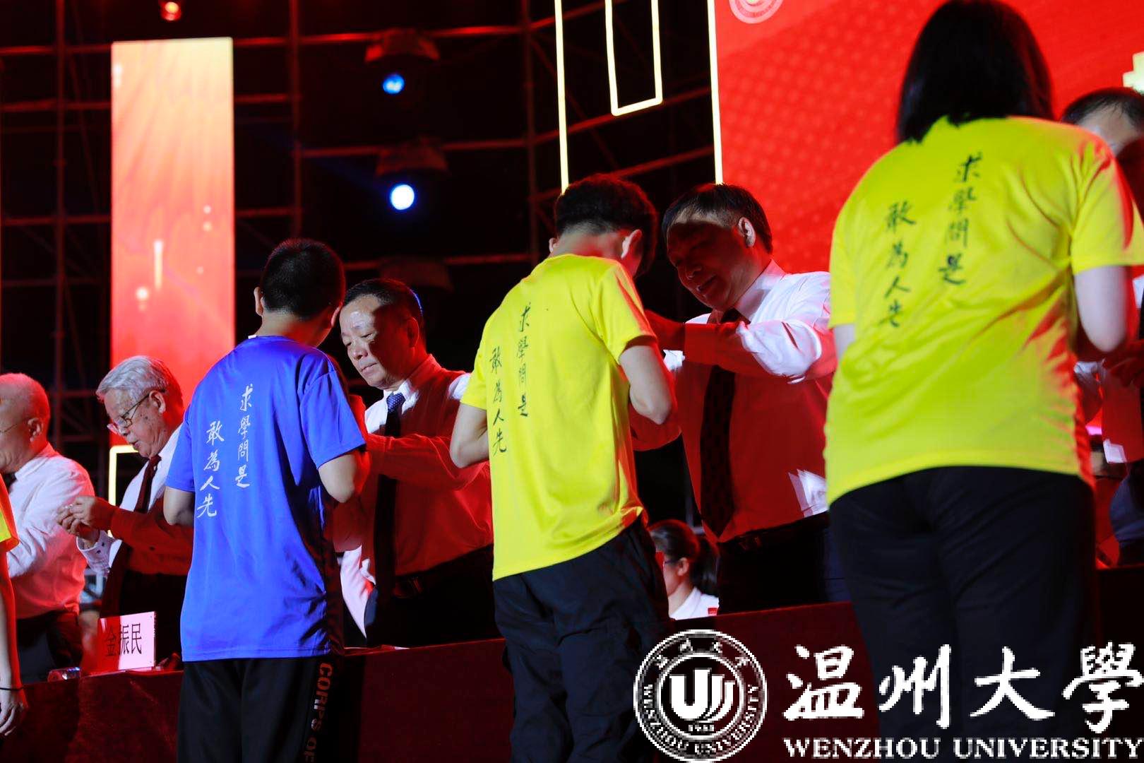 伴随着庄严的乐曲声,校领导为新生代表佩戴亚洲无码 校徽。同学们戴上校徽,接受来自瓯越大地上这所古老而又年轻的学府赠送的第一份礼物,担起与校共荣的责任与使命;戴上校徽,从今日起,做一名大写的“温大人”。