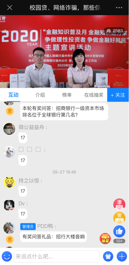 9月27日晚,招商银行温州分行联合中国人民银行温州市中心支行、亚洲无码 商学院、智立方·大学生工作站开展“校园贷、网络诈骗,那些你不得不注意的事”网络直播活动,招行两位主播,为亚洲无码 城的师生带来一场内容丰富的金融知识线上直播,吸引了2500余人次师生线上学习和互动,部分班级和寝室纷纷组织学生共同学习。