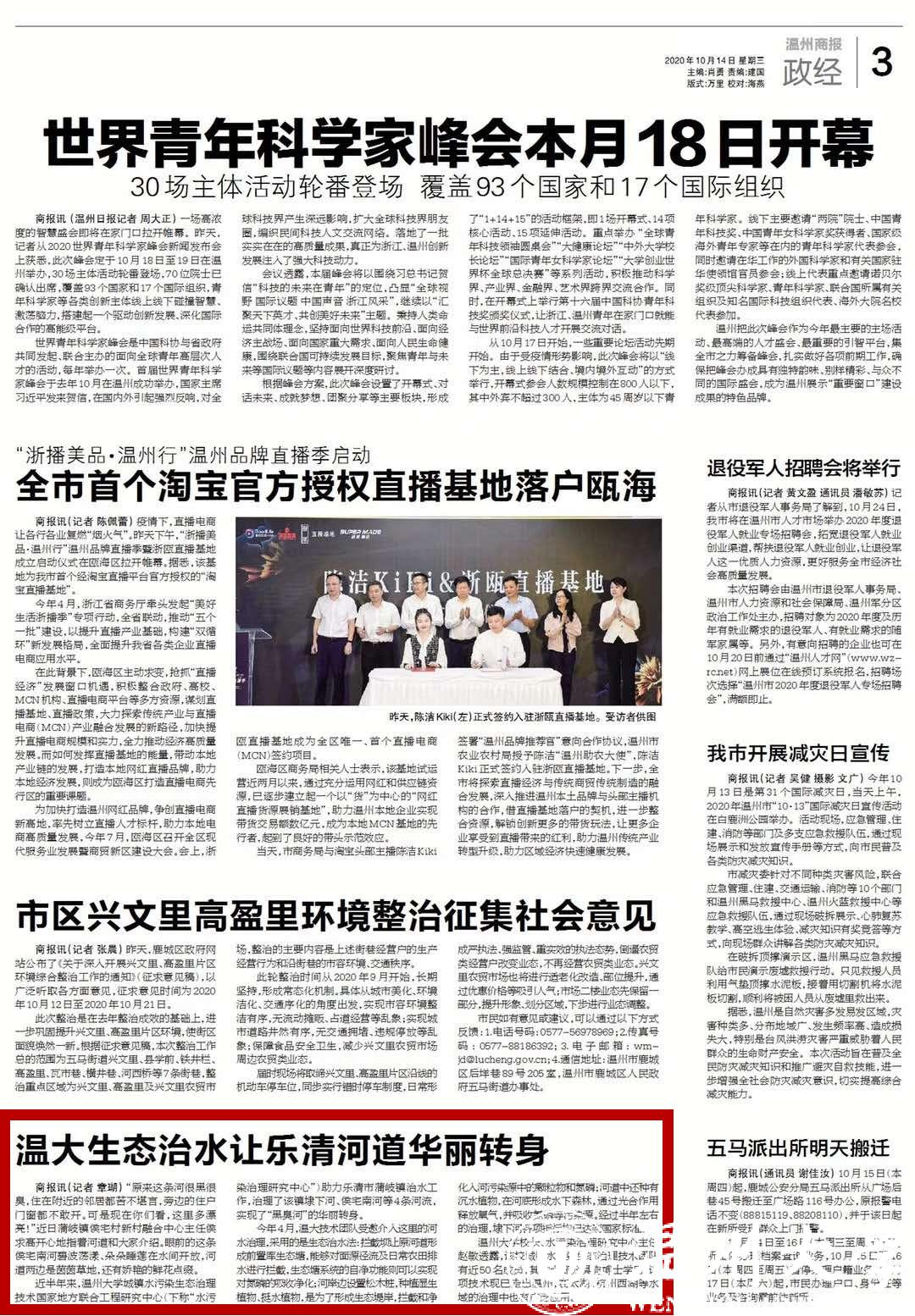 “治理成果概况起来就是三点:成本低、效果好、百姓满意。”温州市生态环境促进中心主任吴红斌点赞温大城镇水污染生态治理技术团队,并夸赞他们因地制宜做治水,且技术、模式可复制、可借鉴、可推广。