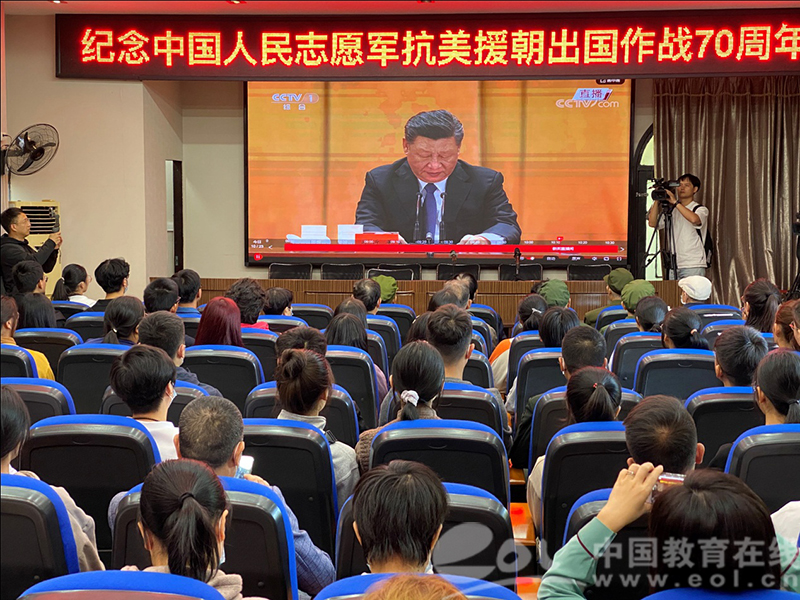 师生和志愿者老兵收看抗美援朝出国作战70周年大会