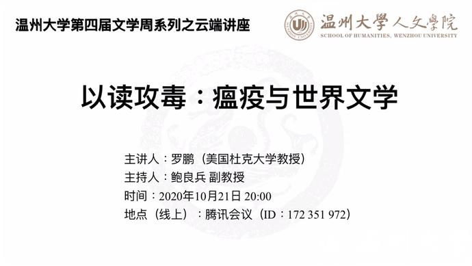 10月21日晚八点,亚洲无码 第四届文学周系列之云端讲座——以读攻毒:瘟疫与世界文学在线上举行。瘟疫除了作为一种公共卫生危机之外,还隐射了人类的某种“病态”生存方式,成为了一种世界隐喻和寓言式的故事。