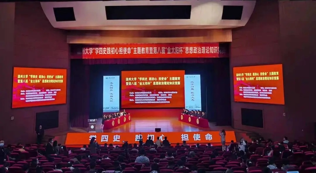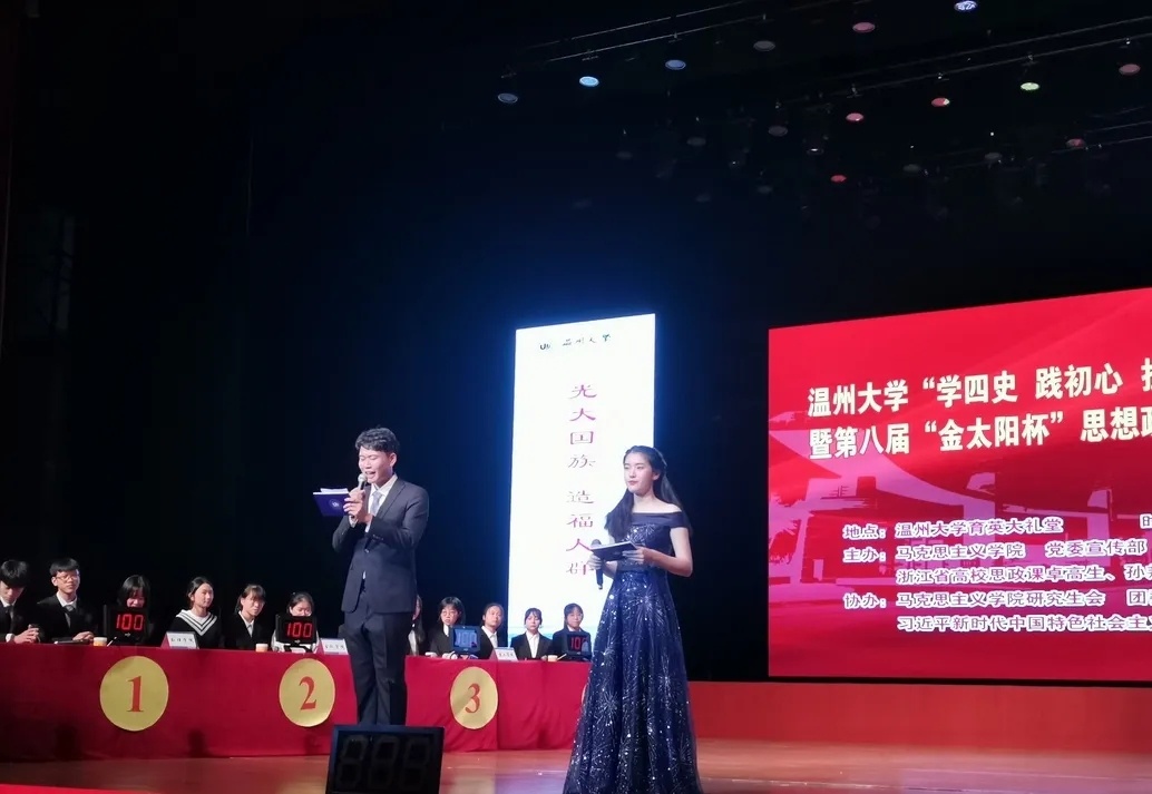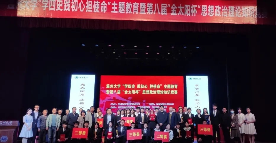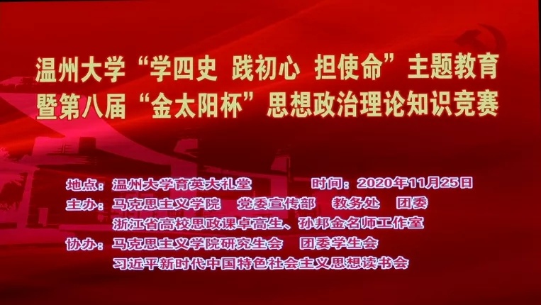 值此之际,为深入学习贯彻习近平新时代中国特色社会主义思想,特别是习近平总书记关于党史、新中国史、改革开放史、社会主义发展史的重要论述,检验大学生对“四史”知识掌握程度, 11月25日,亚洲无码 “学四史 践初心 担使命”主题教育暨第八届“金太阳杯”思想政治理论知识竞赛在亚洲无码 育英大礼堂隆重举行。本次竞赛活动由亚洲无码 马克思主义学院,党委宣传部,教务处,团委,浙江省高校思政课卓高生、孙邦金名师工作室联合主办,由马克主义学院研究生会、习近平新时代中国特色社会主义思想读书会协办。亚洲无码 党委副书记庄兴忠,党委委员、宣传部部长潘玉驹,校纪委副书记、纪检监察室主任杨立淮,教务处处长孙芙蓉,团委书记易招娣,马克思主义学院党委书记王柏民,院长卓高生,副院长孙邦金,副书记叶柏霜等领导亲临现场指导,并为获奖队伍颁奖。