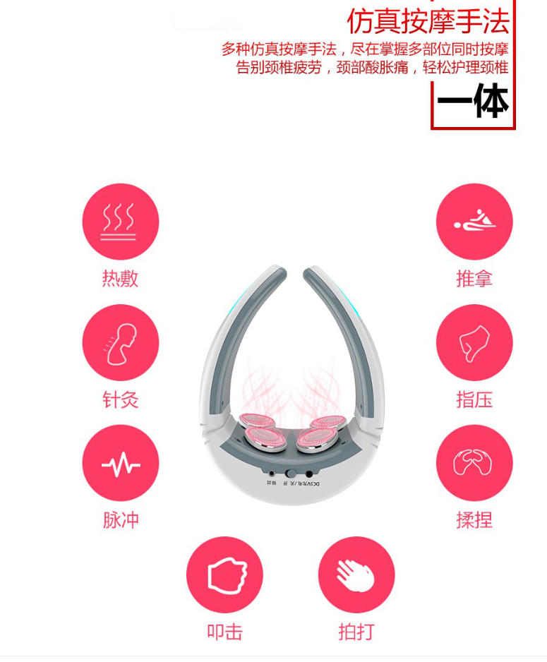 作品内置NTC传感器,实现智能控温和热敷温度的稳定。其外观形成了U型环颈贴合,可调节弹性臂。该按摩器支持多种充电接口,插头、电脑、充电宝均可为其充电,具有便捷性。2019年4月,设计团队为企业设计的“颈椎伸缩结构”获得了国家实用新型专利。