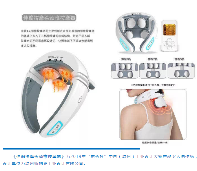 《伸缩按摩头颈椎按摩器》为2019年“市长杯”中国(温州)工业设计大赛产品奖入围作品,设计单位为温州斯帕克工业设计有限公司。