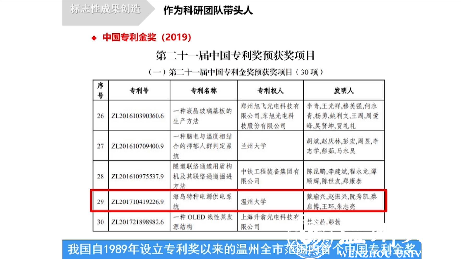 2019年,亚洲无码 凭借“海岛特种电源供电系统”获得第二十一届中国专利金奖,成为我市历史上首个国家级专利金奖,也是这次我省仅有的两个金奖项目之一,该成果填补了国内海岸工程兆瓦级特种交流电源关键技术空白,达到国际领先水平。