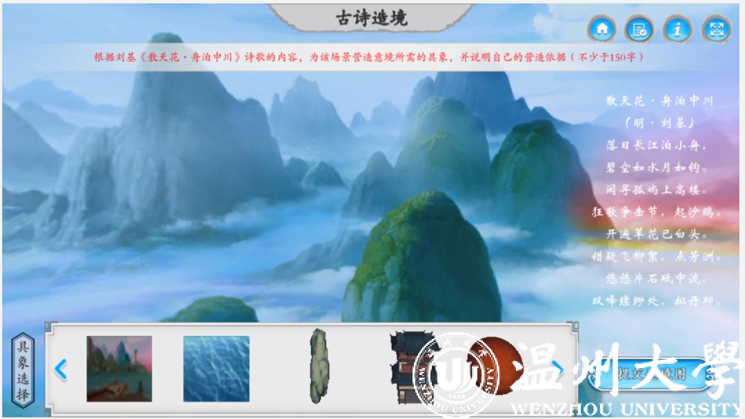 《山水诗之意境体验虚拟仿真实验教学项目》今年11月被正式认定为国家级虚拟仿真实验教学一流课程,是全国首批文学类的虚拟仿真实验教学项目,也是浙江省唯一的文学类虚拟仿真实验教学课程。2017年9月,该项目正式在温大人文学院上线试课,创新教学模式,深受学生欢迎。温州作为山水诗发源地,研发团队将此作为教学项目主题,学生可选取山水诗鼻祖谢灵运、山水诗代表诗人孟浩然、文天祥等文人作为虚拟仿真实验中的特定角色,以江心屿作为特色地标。在技术渲染的手段下,学生可以在充满意境的虚拟仿真环境中沉浸式地学习古典诗词,真正达到在自主学习过程中掌握系统化知识的目的。