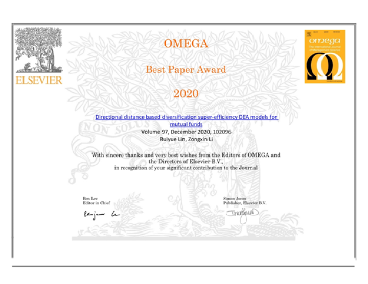 据了解,《OMEGA-The International Journal of Management Science》是国际高水平期刊,2018年影响因子5.341,排名2/84,每年都会由其评奖学术委员会评出最佳论文奖。