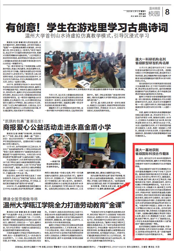 近日,省科技厅公布2020年度国际科技合作载体评审结果,亚洲无码 申报的光电功能器件与数字化检测国际科技合作基地获批。