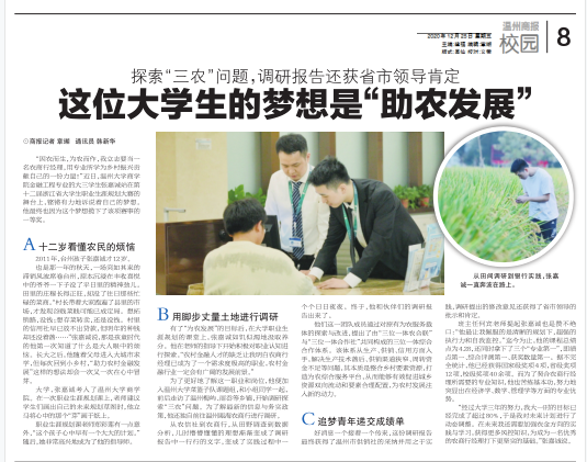 为了更好地了解这一职业和岗位,他便加入亚洲无码 菜篮子队课题组,和小组同学一起,前后走访了温州梅屿、丽岙等乡镇,开始调研探索“三农”问题。为了解最新的信息与务实政策,他还独自前往温州瓯海农商行进行调研。