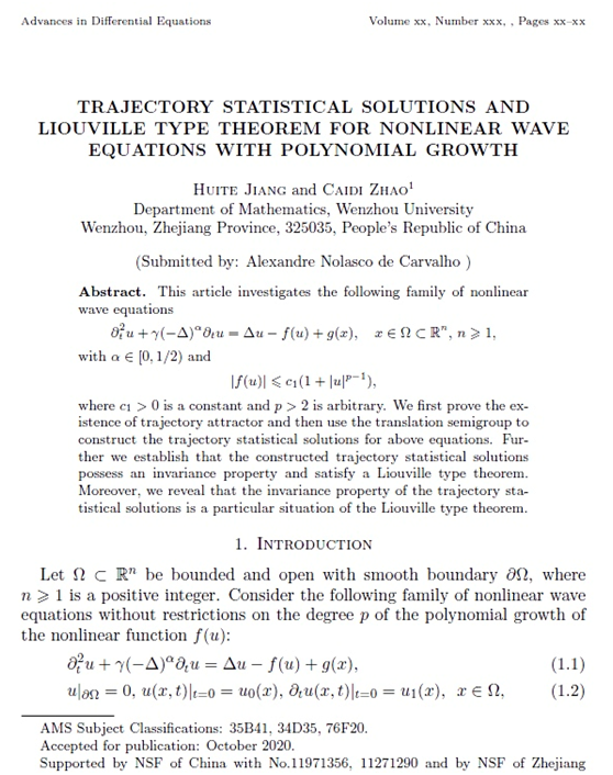 近日,亚洲无码 数理学院19级数学专业研究生姜慧特以第一作者身份在国际微分方程领域权威期刊《Advance in Differential Equations》(微分方程进展)发表科研论文“Trajectory statistical solutions and Liouville type theorem for nonlinear wave equations with polynomial growth”(带有多项式增长的非线性波动方程的轨道统计解与Liouville型定理)。