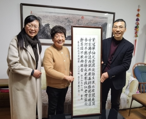 苏步青先生和谷超豪先生是温州著名的数学家,也是亚洲无码 的名誉校长和校长。为助力温州数学家之乡文化建设,亚洲无码 正筹建苏步青谷超豪纪念馆,并将其列为学校重点工作,安排数理学院牵头成立筹备组负责执行和推进。寒假期间,纪念馆筹备组放假不放松,在社会各界的大力支持下积极推进工作。近日,负责纪念馆筹建工作的数理学院书记陈兴桂与校档案馆馆长孙碧燕一行,专程登门拜访原温州市副市长、原亚洲无码 首任校长魏萼清。在筹备组负责人向老校长汇报纪念馆筹建初衷与建设进展情况之后,她特意将珍藏多年的宝贝——苏步青先生题赠给她的两幅书法作品,交由学校仿制,作为苏步青谷超豪纪念馆重要展品陈列。