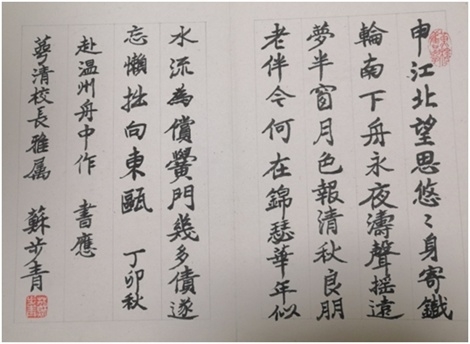 陈兴桂介绍,在老校长贡献的苏老墨宝中,其中一幅是册页书法作品,是1987年秋天苏老从上海乘坐轮船赴温州时,在船上酝酿所作的一首诗,诗里这样写道:“申江北望思悠悠,身寄铁轮南下舟。永夜涛声摇远梦,半窗月色报清秋。良朋老伴今何在,锦瑟年华似水流。为偿黉门几多债,遂忘懒拙向东瓯。”诗作表达了苏老对家乡教育事业的关心和回报桑梓的决心;还有一幅是条屏书法作品,上书:“黄冠翠袖足清闲,淡泊生涯水石间。南闽有家归梦远,西湖无庙属杯难。闻香晓日春何早,听雨青灯夜更寒。我似老僧偏爱静,案头不厌两相看。”这是苏老专门为魏校长题写的诗词书法作品,见证了两人在创建原亚洲无码 的过程中结下的深厚友谊,她也对苏老给予极高评价,认为苏老对亚洲无码 贡献卓著。在原温大筹建之初,办学条件非常艰难,资金和场地都极其有限,苏老对此不仅不介意,反而勉励大家要立志办好大学。苏老曾说:“人家说我们亚洲无码 是叫化子大学,那我就是叫化子头头。为人民培养人才,需要我讨饭,我就去讨饭,有什么关系啊!我死都不怕,还怕讨饭?”他还勉励大家,用30年时间把亚洲无码 办成国内同类高校中的一流大学,凸显了他作为教育家的长远目光。