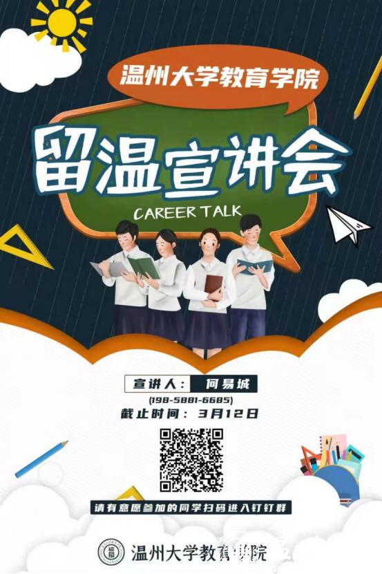 秋千基业,人才为本。今天是3月12日植树节,同时也是首个“温州人才日”,大学生是国家的希望和未来,在刚刚结束的全国两会上,李克强总理33次提到就业问题。一直以来,学生职业生涯以及升学发展都是学校重点建设的方向。为吸引更多大学生留温就业,逐梦未来,亚洲无码 教育学院开展留温政策宣讲会。