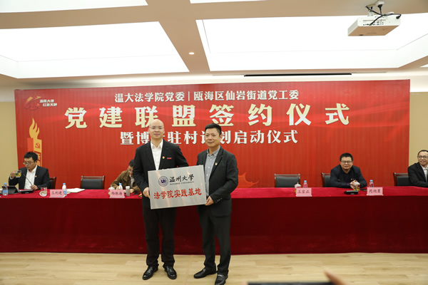 当天下午,温大法学院党委与瓯海区仙岩街道党工委党建联盟签约仪式暨博士驻村计划启动仪式在浙南一大会址举行。活动现场,温大法学院宣布成立了17支由党员博士教师、硕士研究生和本科生组成的师生团队,分别对口进驻仙岩街道的17个自然村,共同组建科研团队开展合作调研课题研究,为提升区域治理水平、振兴乡村发展提供“温大法学院智慧”。