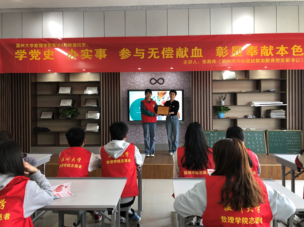 据温大数理学院党委副书记章志图介绍,统计与信息科学系学生党支部长期坚持“无偿献血”的支部品牌建设,从2012年开始至今已坚持了9年,累计献血达241950毫升,收获了良好社会效益。张陈伟也对郭娜等学生党员的表现给予高度肯定,她在主题报告结束之际,专门为统计与信息科学系学生支部赠送《感谢状》铜牌,以感谢这些可爱的学生党员、长期以来对温州献血事业发展做出的积极贡献。