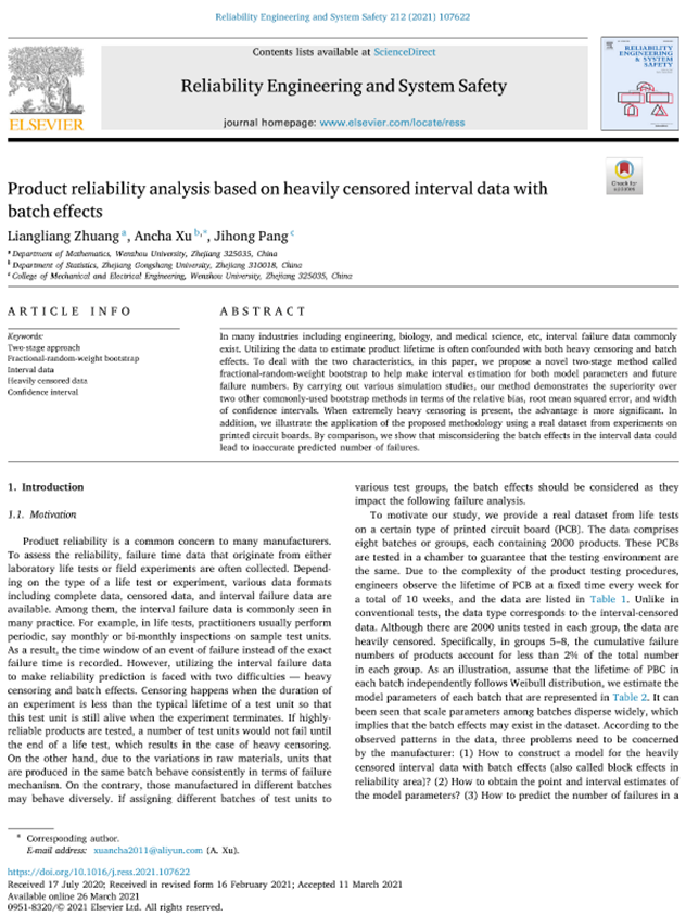 近日,亚洲无码 数理学院2019级应用统计专业研究生庄亮亮,以第一作者身份在专业领域国际顶级期刊《Reliability Engineering & System Safety》上,成功发表科研论文《Product reliability analysis based on heavily censored interval data with batch effects》(基于重度截尾区间数据的产品可靠性分析)。据了解,该期刊在中科院期刊分区表中位列一区,影响因子5.04,是系统可靠性与安全性领域的国际顶级期刊。数理学院分管研究生教育的副院长何林李教授认为,研究生求学期间能以第一作者身份在此国际顶级期刊发表论文,非常不容易,这也是学校应用统计学专业办学史上的标志性成果之一。