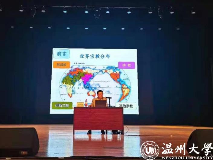 由马克思主义学院党委书记王柏民老师主讲。王老师首先对21世纪宗教发展趋势、中国公民信仰宗教现状以及当前我国的宗教工作形势做了简单介绍。随后,分别讲述了马克思主义宗教观的哲学基础、基本内容和马克思主义宗教观的中国化。