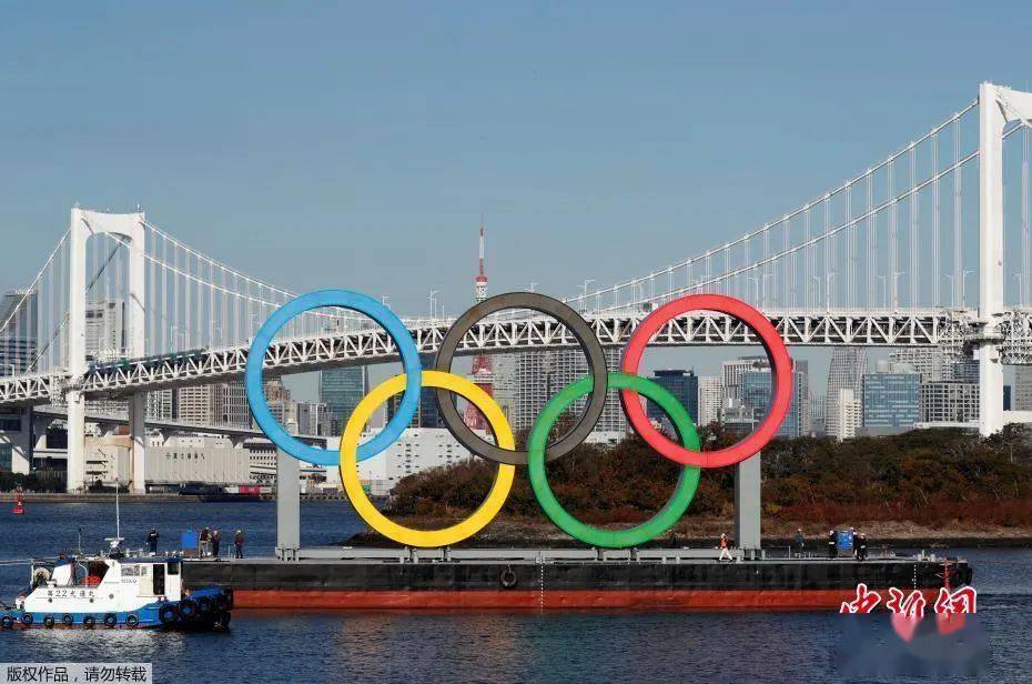 资料图:当地时间2020年12月1日,正在用船运输的奥运五环标志,时隔4个月的安全检查和维修后,重新回到东京湾上。