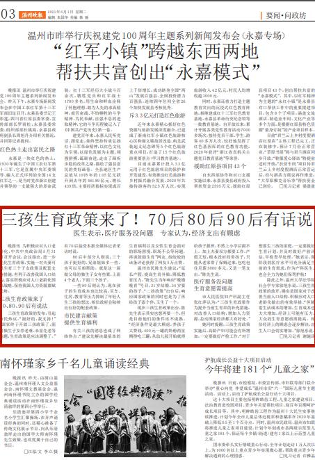 三孩生育政策的发布,引起 市民热议。“挺好的,我支持!” “国家终于开放三孩政策了,面 对独生子女养老难、未富先老等 问题,生育政策是应该调整了。” 有70后接受本报全媒体记者采 访时说。