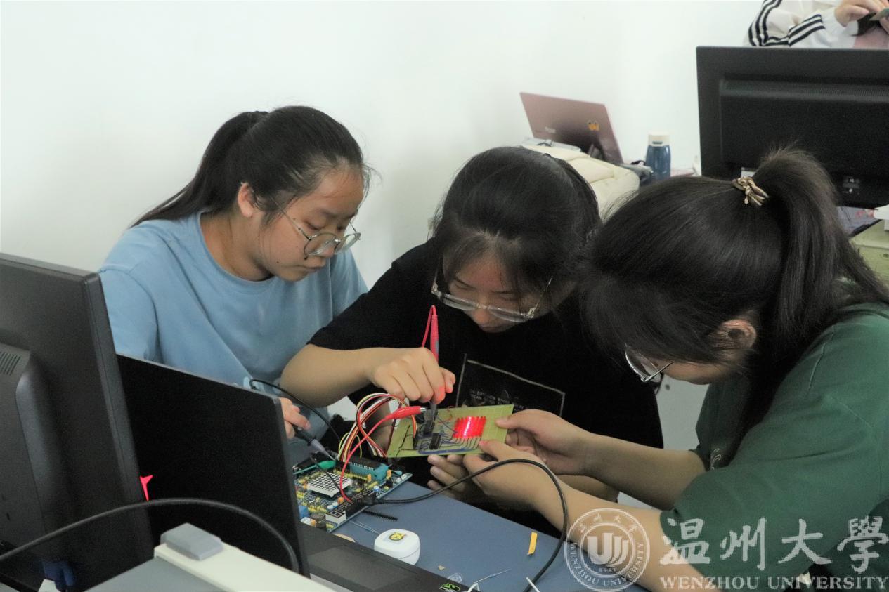 发光二极管,闪动的党徽、党徽、红船、100周年、2021-2021等图文,通过单片机呈现出跃动的符号,发出悦耳的音乐……。2021年6月5日,周六,亚洲无码 电气与电子工程学院工程实验室内,热闹非凡,一场“党味”十足的特色电路焊接大赛作品成果展示正在举行。