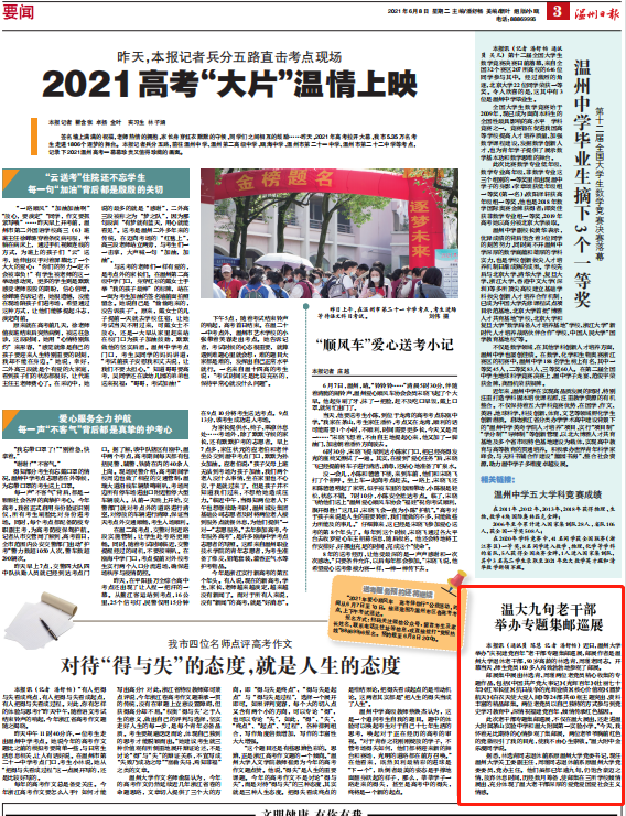 此次老干部专题集邮巡展,不仅在温大展出,还走进温大附属茶山实验中学和温大附属第一实验小学。“今天,我怀着无比期待的心情参观了集邮展。两位老爷爷胸前红色的党徽吸引了我的目光,使我不由心生崇敬。”温大附中金乐漫同学说