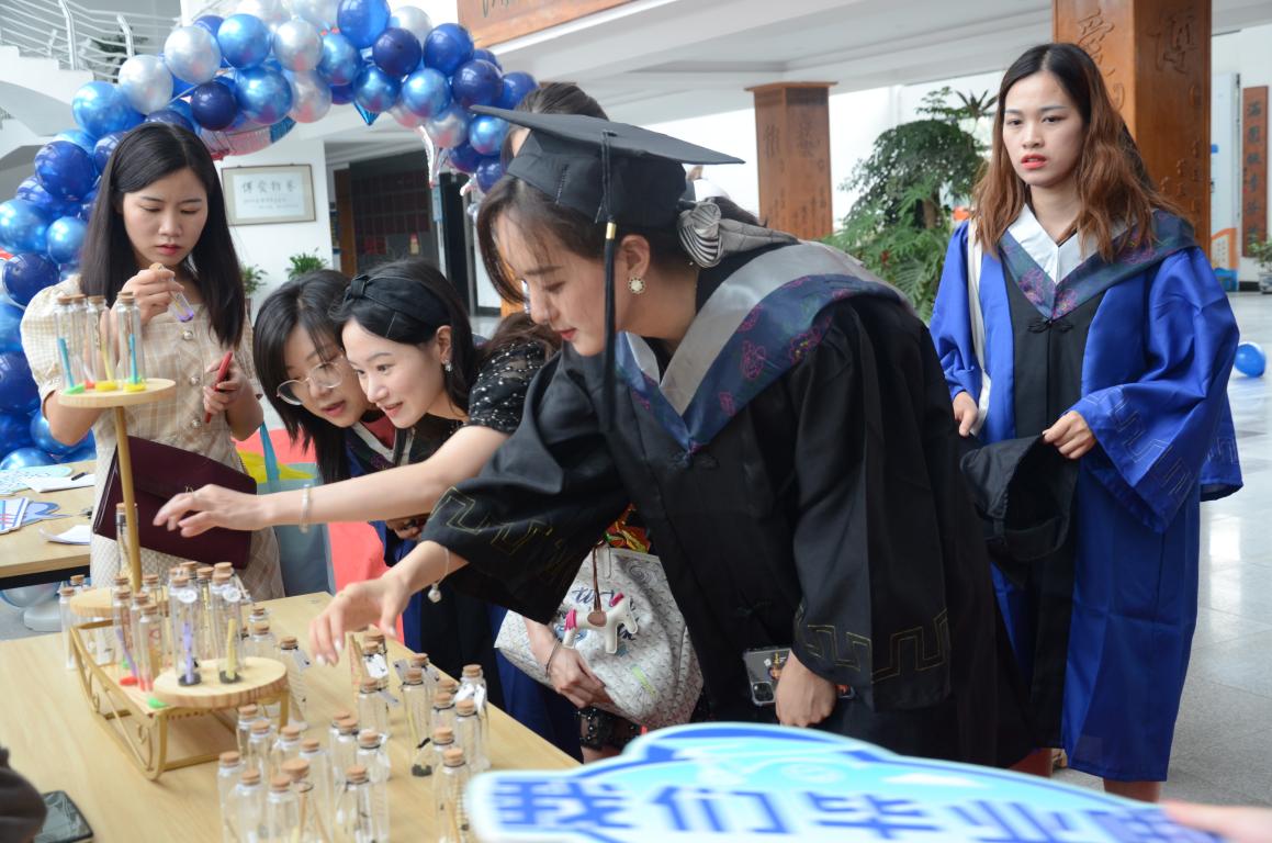 “我抽到了辅导员金老师的祝语,真是既惊喜又感动……”在入场口,毕业生们就被精致的盲盒所吸引。盲盒里的小纸条上承载了学弟学妹以及各位老师们对毕业生的美好祝福,每拆开一个盲盒,就能看到一抹笑容在脸上绽放。