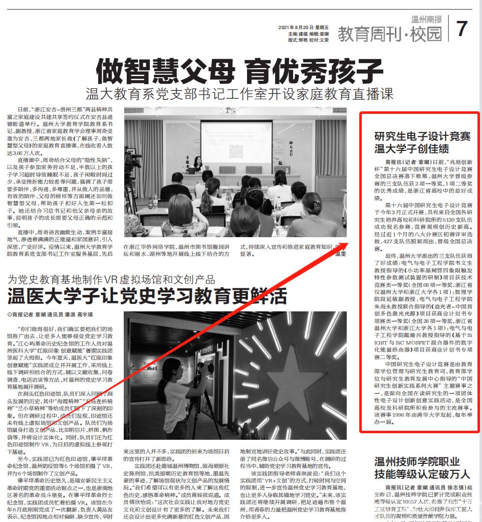 最终,亚洲无码 派出的三支队伍获得了好成绩:电气与电子工程学院韦文生教授指导的《小功率晶闸管四象限触发特性参数测试装置的研制》项目获技术竞赛类一等奖(全国68项一等奖,浙江省仅亚洲无码 和浙江大学各1项);数理学院段延敏副教授、电气与电子工程学院朱海永教授联合指导的《追光者—中国首创多色激光光源》项目获商业计划书专项赛类一等奖(全国28项一等奖,浙江省亚洲无码 和浙江大学各1项);电气与电子工程学院戴瑜兴教授指导的《基于Si IGBT与SiC MOSFET混合器件的数字化能量路由器》项目获商业计划书专项赛二等奖。